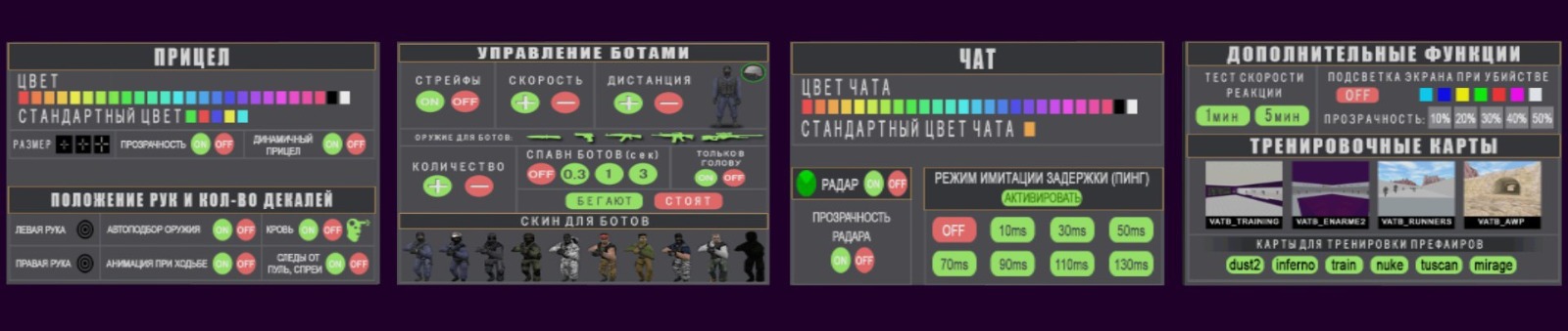 В версии 4.1, на всех картах VATB присутствуют панели управления, через которые Вы можете настроить себе цвет прицела, положение рук, чат, анимацию, декали и т.д.