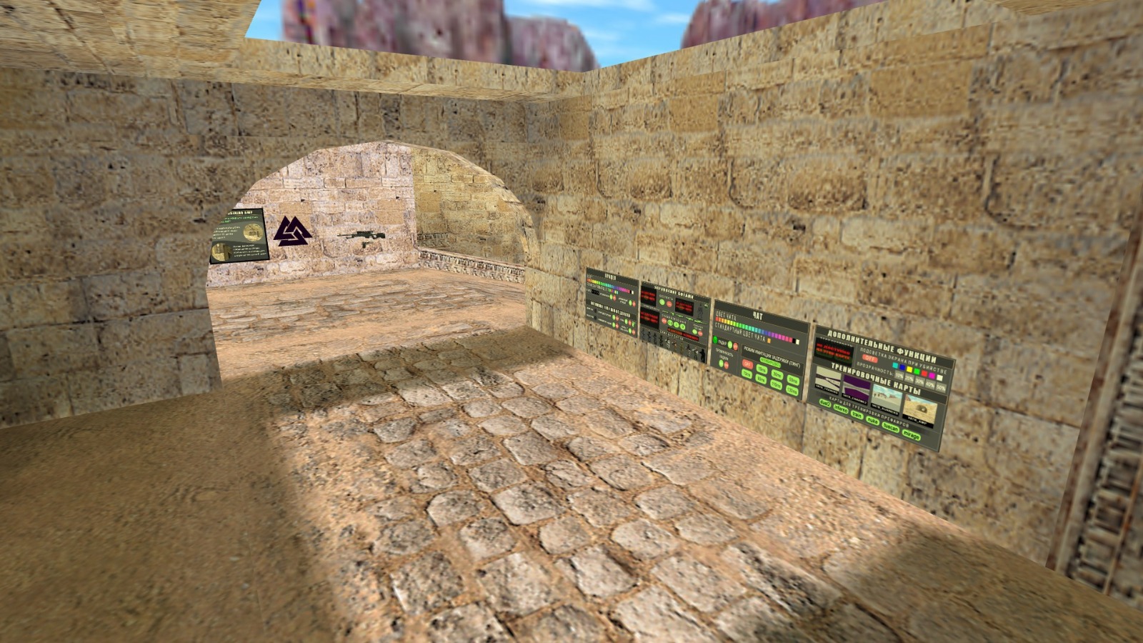 Самая первая и пожалуй самая основная карта для тренировок. Помимо основной панели управления, карта имеет собственную панель управления объектами на карте. Через эту панель Вы можете сменить фон за ботами, под привычные текстуры dust2, nuke, tuscan и т.д. Это создано для удобства. К примеру Вы можете выбирать цвет прицела и Вам захочется посмо-треть, как его будет видно на той или иной текстуре. Функция смены фона Вам в этом